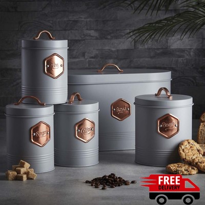 5 Piece Tea Coffee Sugar Storage Jar Set Grey Copper Kitchen