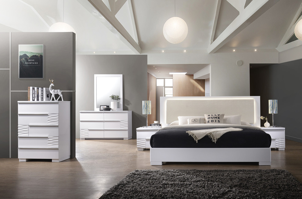 Contemporary White Lacquer Bedroom Furniture 5pc Set W Queen
