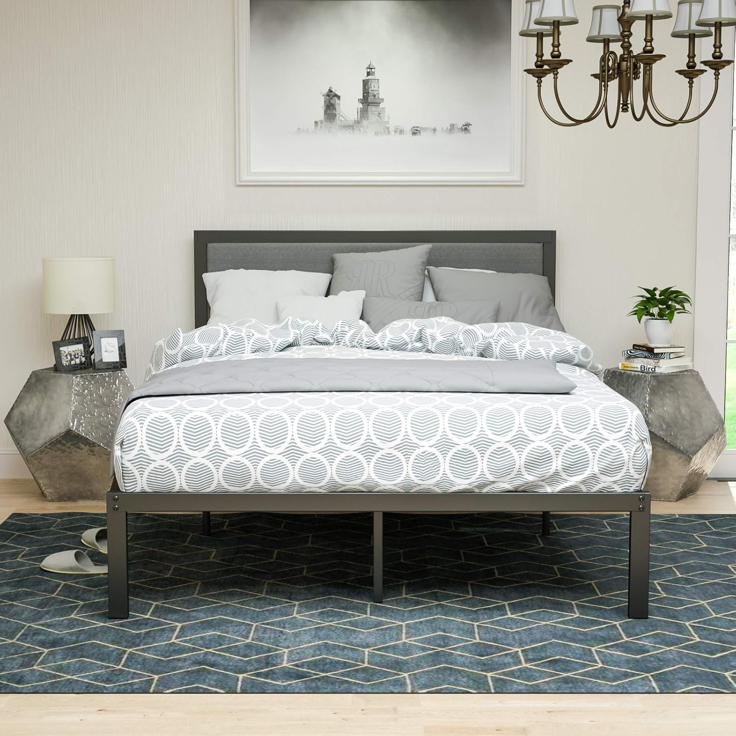 King Size Modern Metal Platform Bed Frame With Beige Upholstered